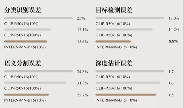 具体而言,基于同样的下游场景数据,“书生”在分类、目标检测、语义分割及深度估计四大任务26个数据集上,平均错误率分别降低了40.2%、47.3%、34.8%和9.4%。